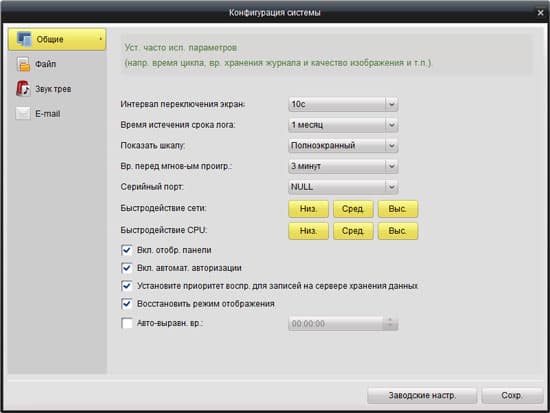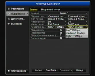 | Определение интервала работы для каждой камеры в отдельности | Настройка параметров записи для каждой камеры: тип потока, частота кадров, три варианта битрейта, время записи, предшествующей событию, а также послезаписи |