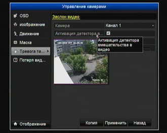 | Настройка включения тревоги при загораживании объектива камеры (попытка закрыть камере обзор) | Настройка включения тревоги при потери сигнала с камеры (вандализм, порча или хищение камеры) |