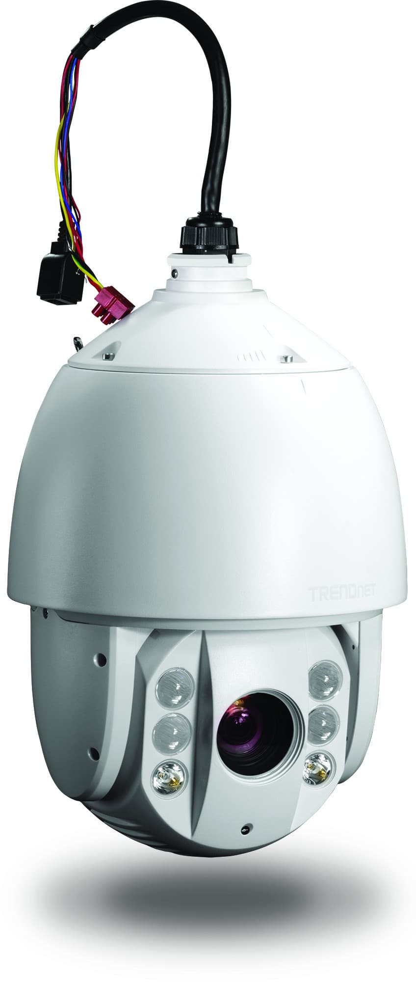 Перед нами классический по своей компоновке купол. Объектив, датчик освещенности и ИК-подсветка — вот и все, что может привлечь к себе внимание при изучении фронтальной части камеры. На верхней же части можно найти шлейф проводов, который имеет несколько предназначений — это и сетевое подключение, и подключение внешней двухсторонней аудиосистемы, и, при необходимости, подача питания на камеру (хотя производителем и предусмотрен PoE-инжектор, идущий в комплекте поставки):