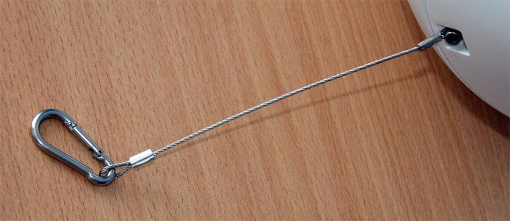 Присмотревшись еще внимательнее, обнаруживаем металлический трос с карабином:
