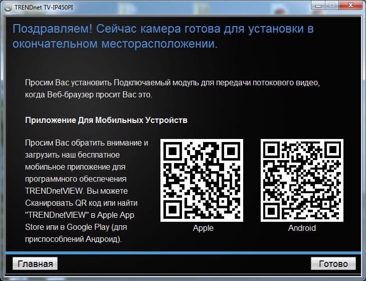 | Первый этап — автоматический поиск в сети включенных IP-камер: | И второй — поздравление с успешным завершением первоначальной конфигурации и предложение воспользоваться QR-кодами для загрузки мобильных приложений: |