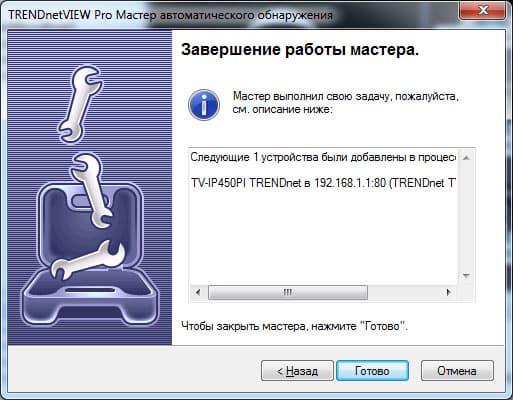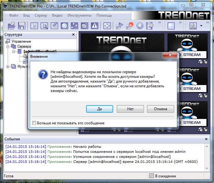 На этом установка и первоначальная конфигурация завершены, и далее мы ознакомимся с установленным ПО. Если по каким-либо причинам вы ранее не выполнили поиск IP-камеры, вы сможете сделать это сразу после запуска программы (точнее — программа сама предложит вам сделать это):