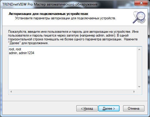 | Соглашаемся на предложение, и далее нам предлагают перечислить все используемые в нашей системе видеонаблюдения имена и пароли от IP-камер: | Опять-таки соглашаемся на предложение и указываем требуемое. После чего начнется недолгий процесс поиска IP-камер, который завершится окном отчета: |
