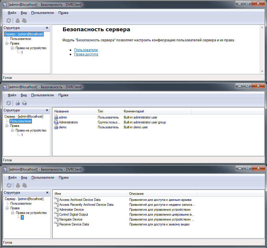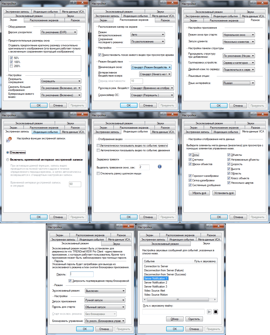 Как видно выше, программа может быть отконфигурирована очень гибко. Отметим отдельно возможность использования «Эксклюзивного режима» — в нем пользователю доступна работа только с системой видеонаблюдения, все остальные системные приложения в среде Windows становятся недоступны. Для просмотра архивных видеозаписей предусмотрен отдельный программный модуль: