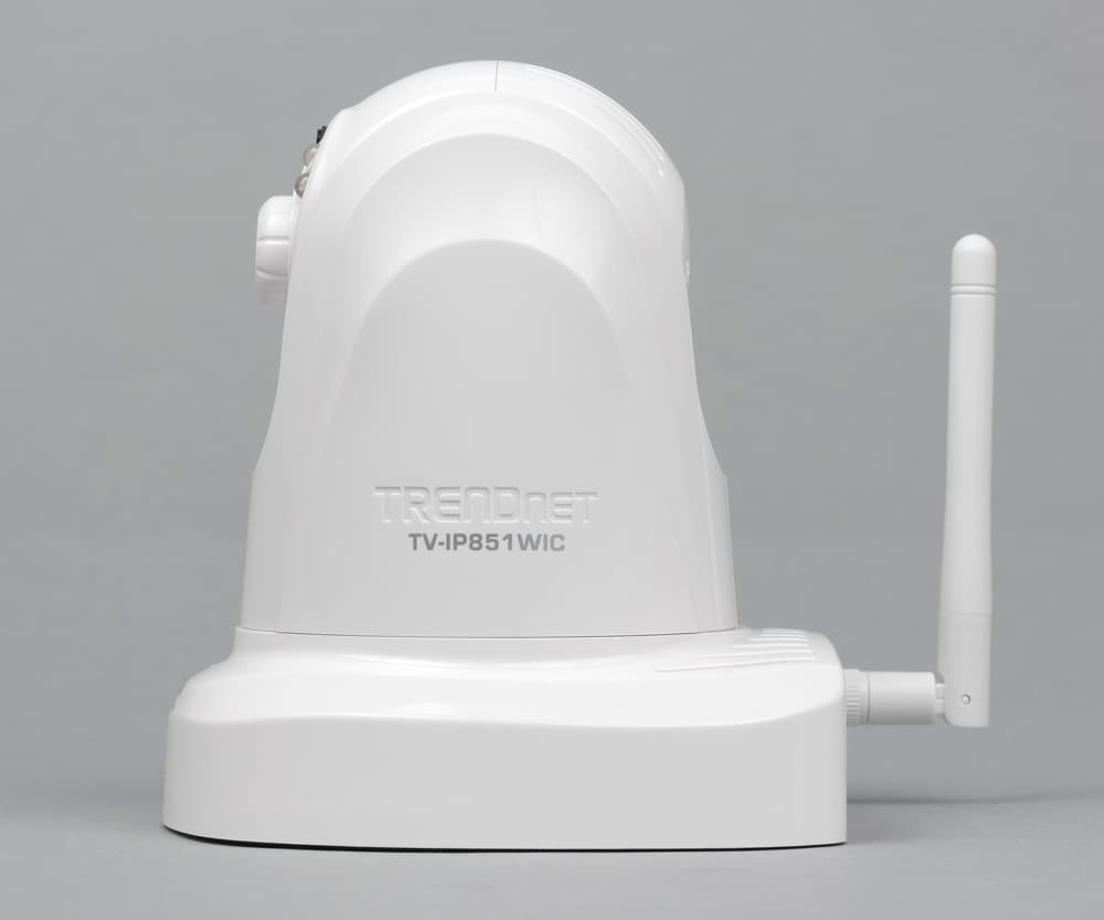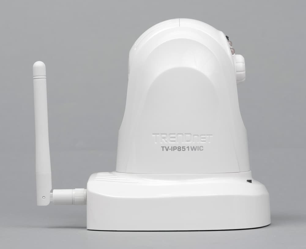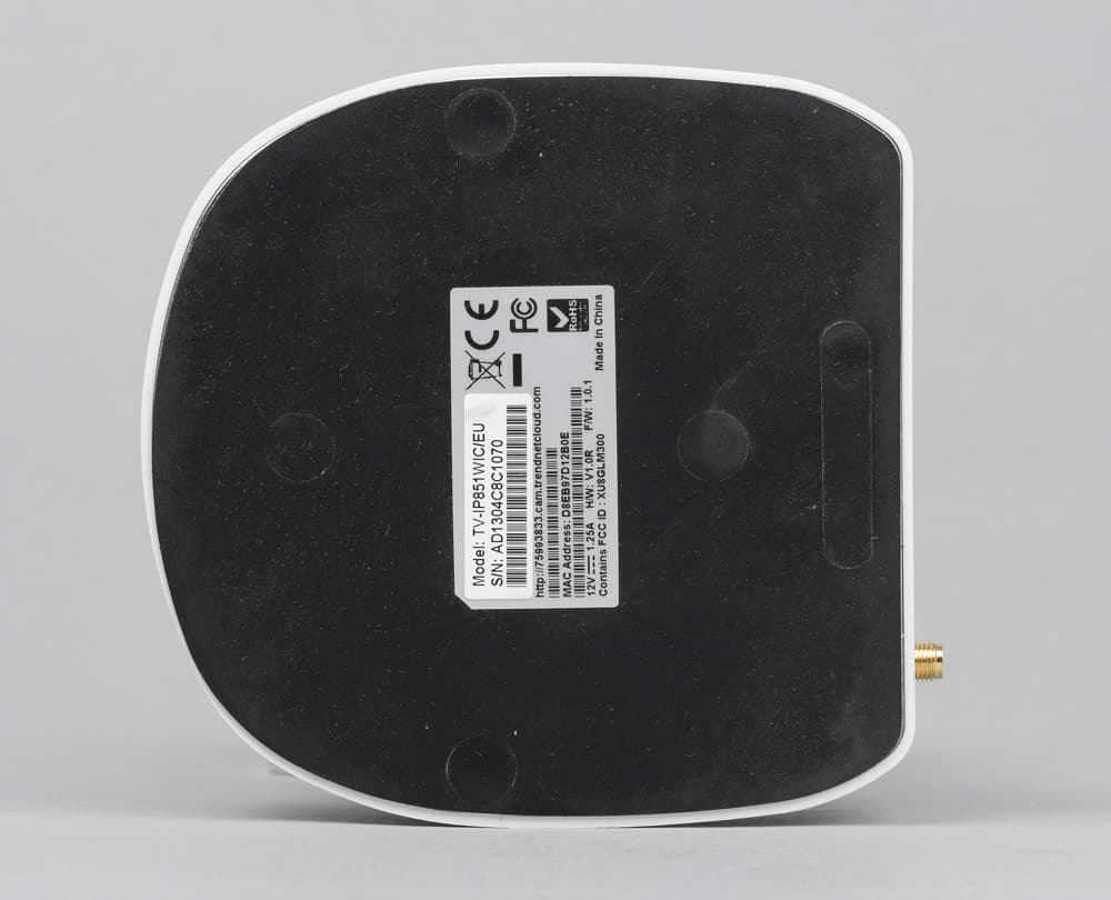 Внешне камера TV-IP851WIC представляет собой вращающуюся башенку на круглом основании, в верхней части которой на шарнире закреплен шарик с объективом и матрицей (т.е. собственно камера), а также микрофон, четыре светодиода ИК-подсветки и датчик освещенности. Внутри башенки и основания находятся поворотные механизмы с серводвигателями, позволяющие ориентировать объектив в двух плоскостях, в том числе дистанционно. Все наружные части сделаны из молочно-белого глянцевого пластика (производитель называет его светло-серым).