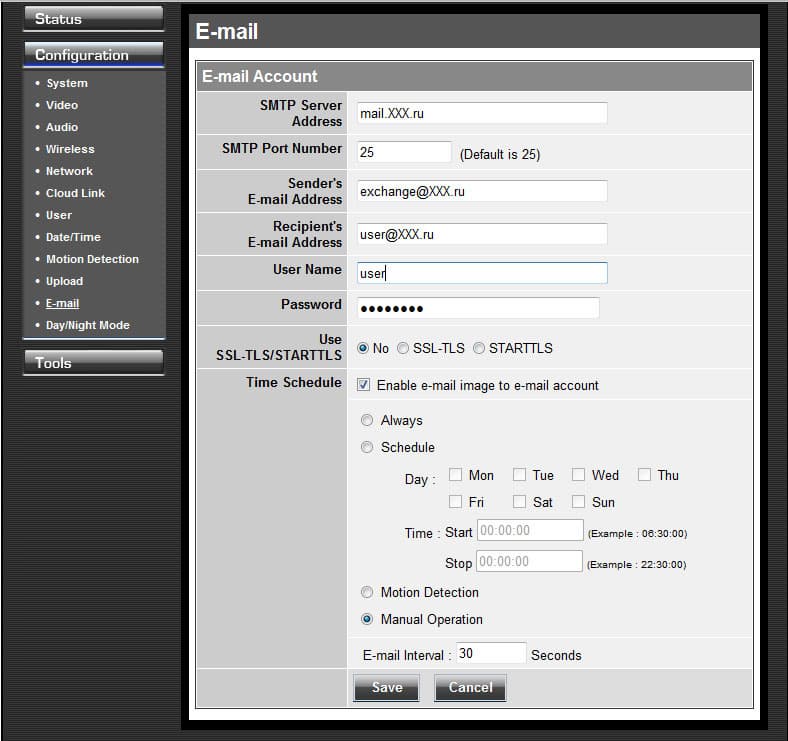 При отправке на e-mail, конечно же, отправляются не видеофрагменты, а отдельные кадры в формате JPEG и «весом» в десятки килобайт при разрешении 640×480. При этом можно задать периодичность отправки — например, каждые 15 минут, причем как постоянно, так и по расписанию (в определенные интервалы времени и в заданные дни недели), а также назначить отправку при обнаружении движения или инициировать ее вручную вышеупомянутой кнопкой.