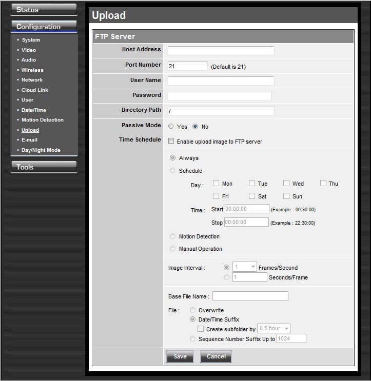 То же происходит и с записью на FTP-сервер: записываются кадры, можно лишь задать либо количество кадров в секунду (до 4), либо интервал в секундах между записями. Конечно, есть возможность задать параметры, связанные с именами файлов и созданием папок для их сохранения (например, каждый час или каждые сутки).