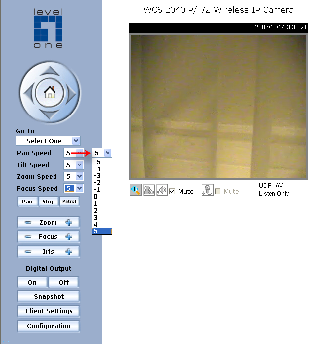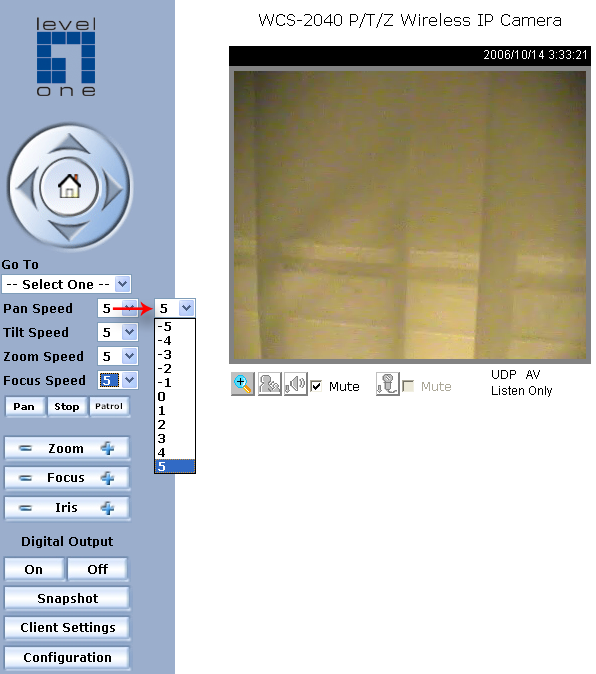 Кнопки со стрелочками, расположенные в верхней левой части интерфейса позволяют манипулировать ориентацией камеры. Кнопка "Home" находящаяся посередине приводит камеру в первоначальное положение - данное положение занимает камера сразу же после включения питания.