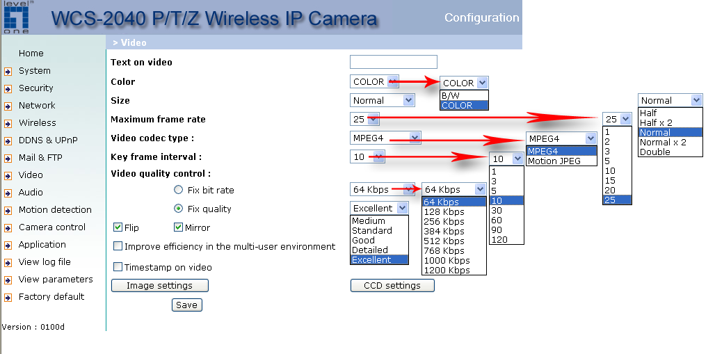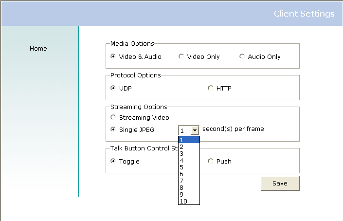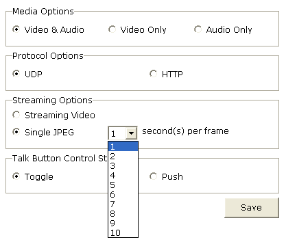Здесь выбирается будет ли передаваться аудиопоток вместе с видеоданными, какой протокол будет использоваться для передачи данных. Также возможен выбор между потоковым видео или же устройство будет передавать фотографии в формате JPEG раз в несколько секунд.