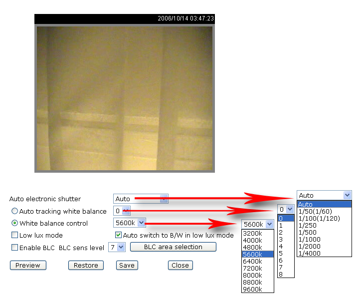 В параметрах "CCD Settings" задаются параметры "баланса белого", использование режима пониженной освещенности, а также программной выдержки. Если установить параметры выдержки в режим "Auto", то диафрагма не будет изменяться, а будет изменяться только выдержка. Параметр "BLC" означает "Back light compensation" - манипуляция с параметрами BLC позволяет более четко видеть объекты находящиеся перед источником света. Для работы данный функции необходимо задать уровень чувствительности (BLC sens level),