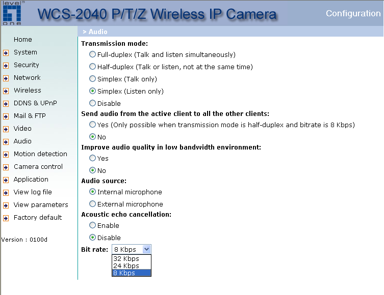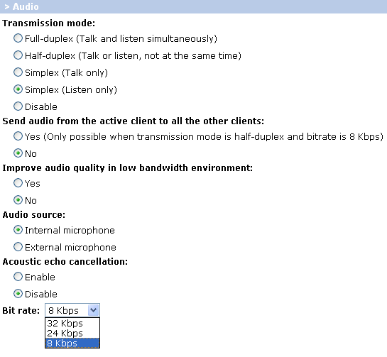 Далее задаются параметры аудиопотока - задается битрэйт аудиопотока. Также возможно подключение динамика для двустороннего общения.