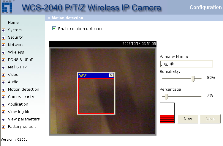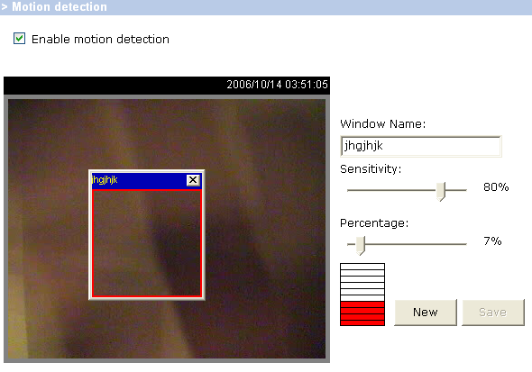 Данная камера имеет возможность "Motion detection" - обнаружение движения. Для этого можно выбрать 3 окна различных размеров с различным значением чувствительности. Если хотя бы в одном окне происходит изменение выше заданного уровня, происходит срабатывание "Motion detection", однако само по себе включение данной функции ни к чему не приводит - данная возможность может быть использована при записи изображения. Для каждого окна задается чувствительность, а также "процент" изменения изображения, необходимы для срабатывания возможности "Motion Detection". Чем выше "Sensivity" и ниже "Percentage", тем больше шансов срабатывания "Motion detection".