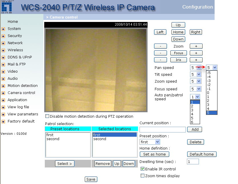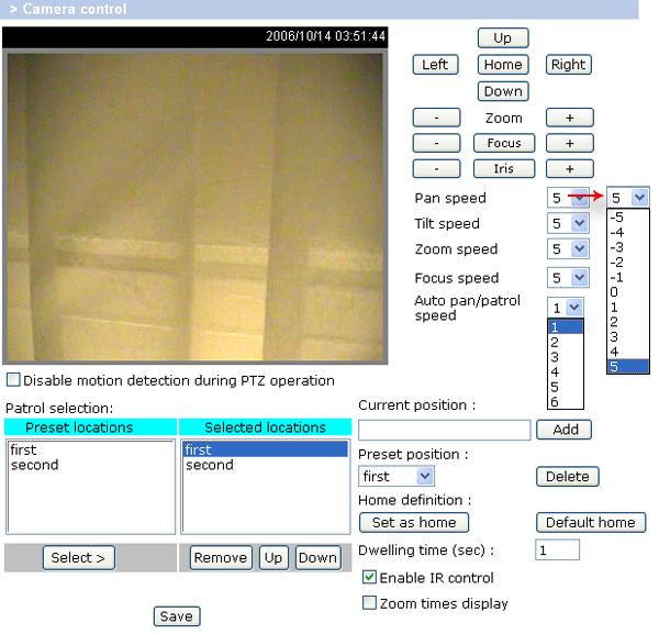 Возможна автоматизация управления камерой - мы можем запомнить несколько позиций и впоследствии переключаться между ними выбирая их в главном окне управления камерой (параметр "Go To"). Также можно задать до 20 позиций положения камеры, который будут использованы при режиме "патрулирования" (Patrol). Параметр "Dwelling time" задает время паузы которую будет выдерживать камера при переключении между позициями (задается одно время для всех позиций, то есть мы не можем сделать так, чтобы время паузы в одной позиции отличалась от времени паузы в другой).