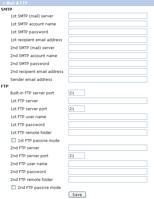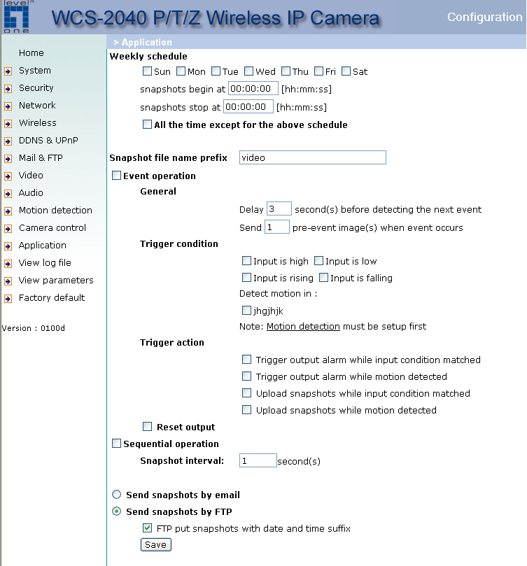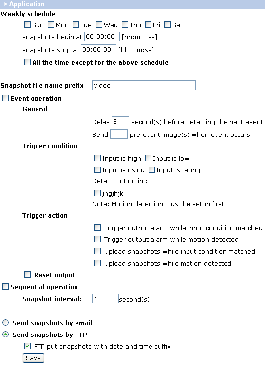 В параметрах "General" задается время задержки после срабатывания отслеживаемого события. Например если произошло срабатывание детекции движения (Motion Detection), то повторное срабатывание события не произойдет в течение заданного времени, иначе на FTP-сервер или на почту будет посылаться очень много скриншотов с камеры. Здесь можно задать, чтобы на сервер (или на почту) пересылалось несколько скриншотов, снятых камерой непосредственно до свершения события (получается своеобразная серия фотографий, которая включает фотографии непосредственно предшествующие срабатыванию события).