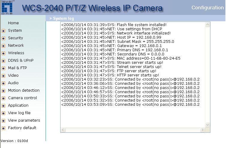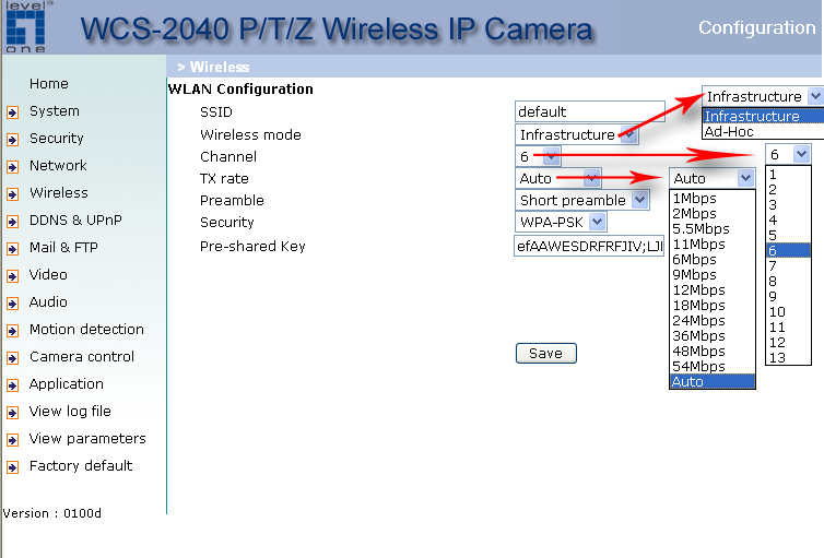 Беспроводной интерфейс данной камеры позволяет произвести подключение к точке доступа (в режиме Infrastructure) или же к другому беспроводному адаптеру (в режиме AdHoc). В режиме AdHoc возможно соединение на скорости не выше 11 Мбит/с. Возможные режимы шифрования WEP и WPA-PSK.
