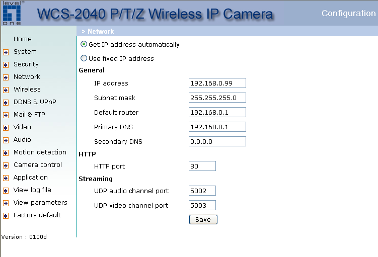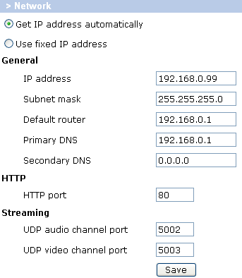В параметрах сети задается IP-адрес устройства (или же получение адреса посредством DHCP), порты которые будут использоваться для передачи видео и аудиоданных, а также порт, по которому камера будет доступна через HTTP (по умолчанию 80).