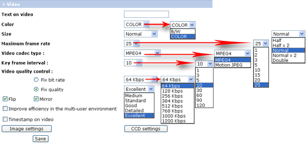 Далее задаются параметры видеопотока - здесь выбирается качество потока, тип кодека (MPEG4 или Motion JPEG), количество кадров в секунду. Также можно отказаться от цветной картинки в пользу черно-белой. Возможно зеркальное отображение как по горизонтали, так и по вертикали - это может потребоваться если камера расположена на стене или потолке.