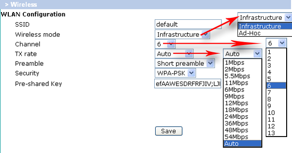 В пункте Wireless задаются настройки беспроводной сети. Возможно подключение как к точке доступа (в режиме Infrastructure) , так и к другим беспроводным адаптерам (в режиме AdHoc). Здесь же задается канал беспроводной связи, тип шифрования и ключи. Возможно использование 64 или 128-битного WEP-шифрования, а также WPA-PSK-шифрования. Имеется возможность задать скорость беспроводного соединения.