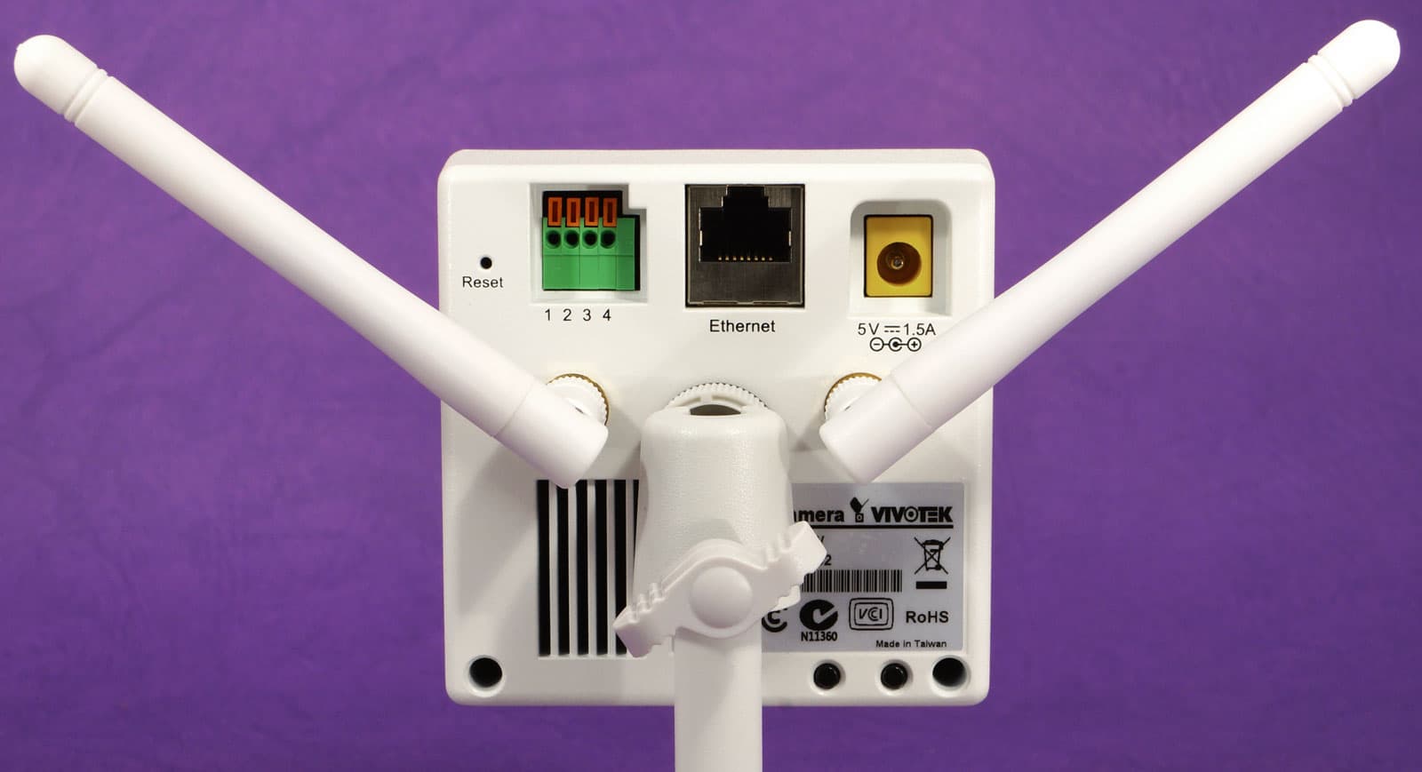 На задней части корпуса расположены утопленная кнопка Reset, перезагружающая камеру, входы и выходы внешних цифровых датчиков, Ethernet-порт и разъем сетевого адаптера питания. Чуть ниже, под разъемами антенн и резьбовым отверстием обычного видео/фотокамерного стандарта 1/4″, имеется вентиляционная решетка. По нижнему краю корпуса размещены две кнопки: WPS, обеспечивающая быстрое и простое подключение к беспроводной сети, и кнопка Privacy, нажатие которой временно отключает функцию видеомониторинга.