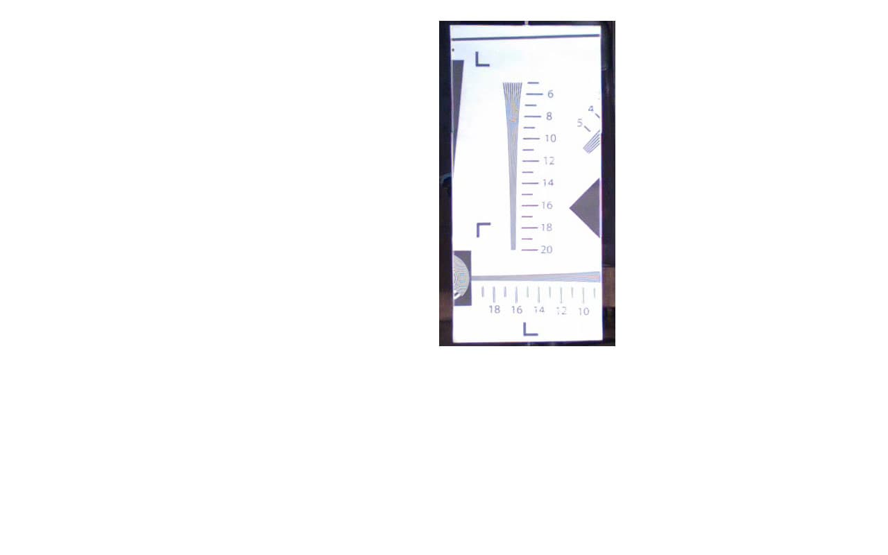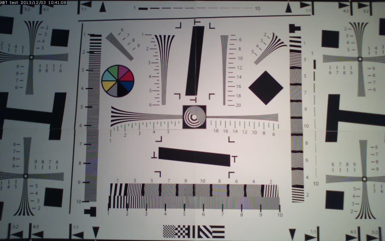 А вот тут возникает вопрос: какова же истинная разрешающая способность аппарата? Чтобы ответить на него, потребуется снять тестовую таблицу. Однако нас встречают привычные сложности. Первая — размер кадра. Максимальное значение в камере равняется 1280×800, то есть, соотношение сторон в таком кадре составляет 16:10. Но хорошо, примерное расположение таблицы в кадре можно все-таки установить, на глазок.