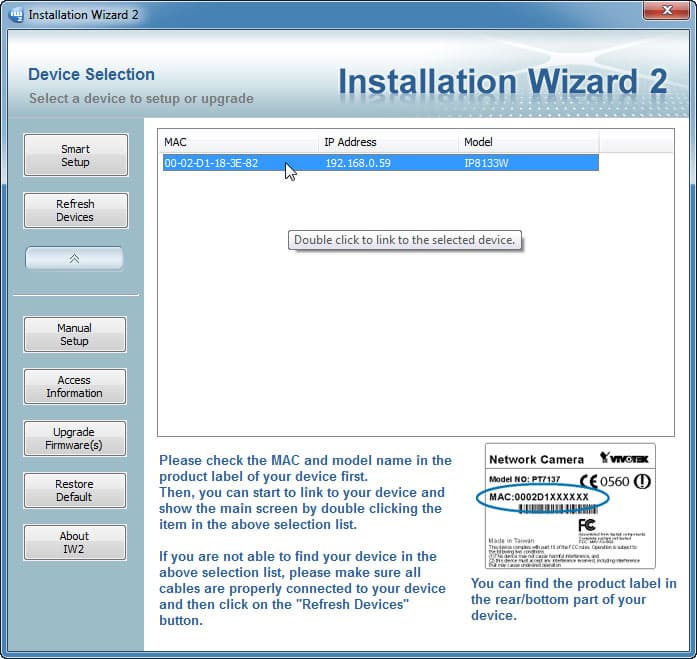 В первую очередь обратимся к утилите, помогающей отыскать в локальной сети нашу только что подключенную камеру — Installation Wisard 2 (помимо нее, на диске также присутствует бесплатное приложение — центр управления камерами и записями, полученными с их помощью).