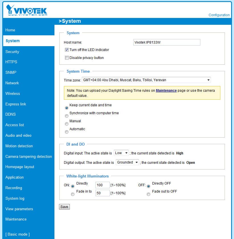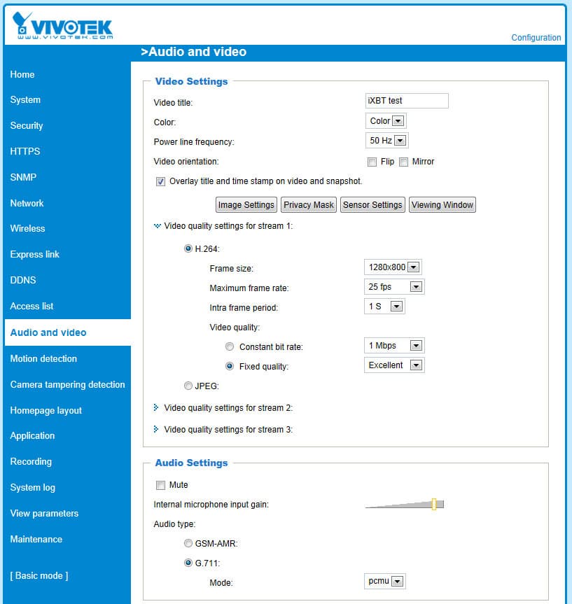 Основные настройки камеры открываются по ссылке Configuration. Эти настройки разбиты на почти два десятка разделов, каждый из которых отвечает за параметры системы, сети и сетевых сервисов, безопасность, свойства и характеристики видеопотока, качество и чувствительность картинки и звука, детекцию движения и многое другое.