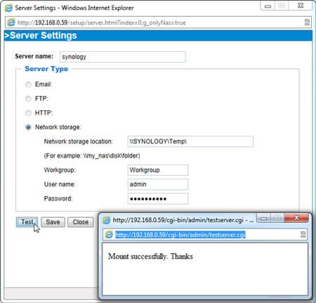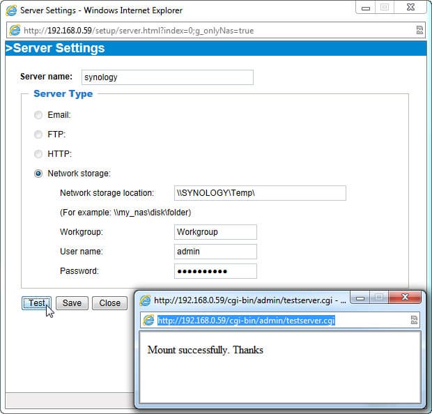 Файлы с камеры могут сохраняться на FTP или HTTP сервер, в сетевое файловое хранилище, или отсылаться по электронной почте. Настройки адресов указанных хранилищ вводятся на странице Server Settings. На следующем скриншоте видно, как камера успешно установила связь с домашним NAS. Кстати, кнопка Test на данной странице — чертовски удобная штука. Нажав ее, можно быстро проверить правильность адреса и прочих реквизитов сервера, а также его работоспособность.
