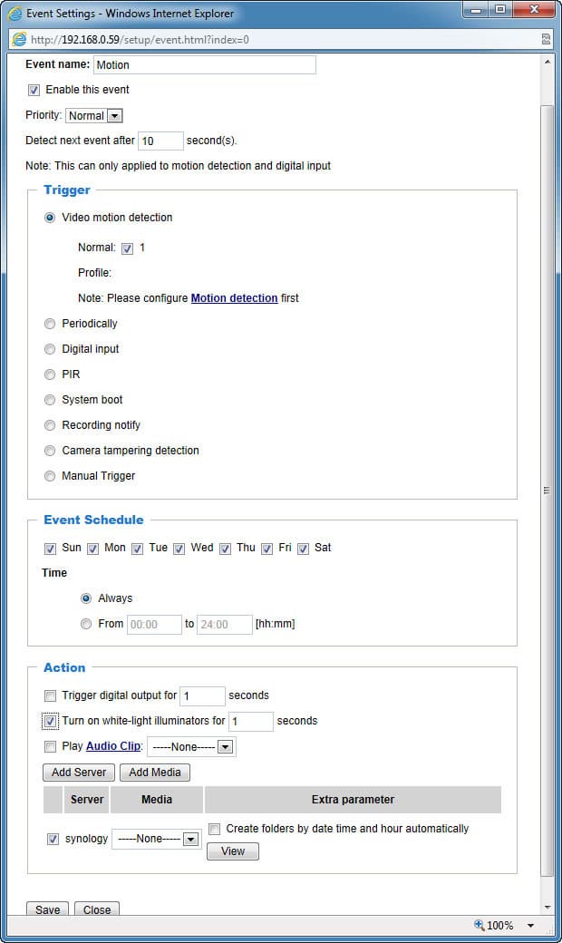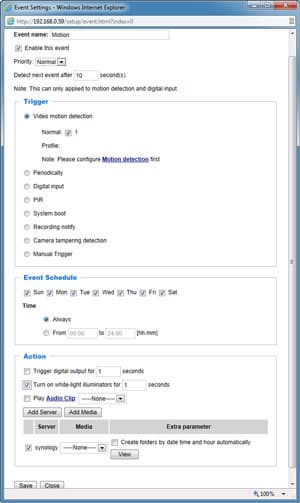 Заключительный этап подготовки камеры к работе — настройка событий, Event Settings. Здесь имеется возможность настроить реакцию камеры на то или иное событие. В качестве события могут выступать следующие прецеденты: срабатывание детектора движения, подача сигнала по цифровому входу, срабатывание инфракрасного датчика присутствия, загрузка системы, несанкционированный доступ к камере. Также события могут обрабатываться с заданной периодичностью. Ответ камеры на то или иное событие может заключаться в подаче сигнала на цифровой выход, включении лампы подсветки, воспроизведении заранее записанного звукового отрезка, а также в отправке видеофайла или стопкадра, содержащего зафиксированное событие, на указанный сервер.