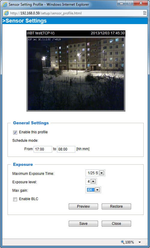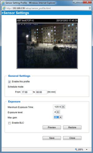 Важный момент, подчеркивающий достаточно глубокую работу инженеров над прошивкой камеры: настройки усиления и экспозиции можно сохранить в профиль, ограничив работу этого профиля по времени суток — например, специально для ночного периода, выставить усиление повыше. Таким образом, днем, при достаточном количестве света, камера будет работать в обычном режиме, а с наступлением темноты автоматически активируется заданный профиль и включится усиление сигнала.