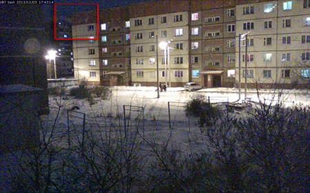 В первую очередь вкратце расскажем об инфракрасном датчике движения, или, иначе, датчике присутствия, который встроен в камеру. «Вкратце» потому, что рассказывать тут, собственно, не о чем. Всем известны такие датчики, они являются неотъемлемой частью любой пожарно-охранной системы, и устанавливаются обычно над входом в помещение, либо так, чтобы в их «поле зрения» находились окна и другие проемы, через которые может проникнуть злоумышленник. Максимальное расстояние, на котором датчик нашей камеры видит человека, определить не удалось — не хватило площади помещения, где проводились тесты. Но, по крайней мере с расстояния в шесть метров камера чутко реагирует на тепло человеческого тела. Таким образом, перед нами — чудесный инструмент для видеонаблюдения... в полной темноте! Представим ситуацию: злоумышленник, пользуясь отсутствием света и не страшась никаких камер, проникает в помещение, и тут же попадает под прицел инфракрасного датчика. Камера реагирует на это согласно заданной программе: немедленно включает лампу подсветки, фиксирует на фото или видео ошалевшее лицо злоумышленника, и отсылает данный снимок по нужному электронному адресу. Следующий стопкадр сделан камерой в затемненном помещении в момент срабатывания инфракрасного датчика присутствия при автоматически включившейся LED-подсветке.