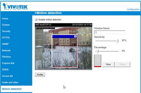 Как и в случае с настройкой сенсора изображения, настройки детектора движения можно сохранить в профиль, задав ему определенное время действия. Например, днем камера может контролировать холл здания, а по окончании рабочего времени и до следующего утра внимание камеры может быть переключено на входную дверь.