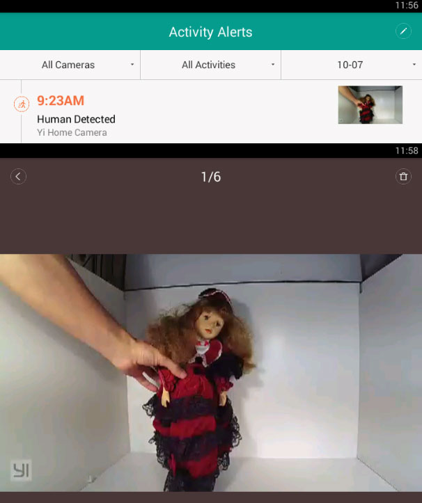 Кстати, можно подумать, что просматриваемые пользователем записанные события хранятся в облачном сервисе Yi. Но это не так. На самом деле в облако записывается лишь миниатюра события и ссылка на него, сам же материал хранится на карте памяти, вставленной в камеру. За время тестирования было отмечено, что иногда миниатюра видеоролика не отображается в списке событий, вместо нее программа показывает «заглушку» в виде фотоснимка красивого интерьера. Какую-либо систему в отображении или не отображении истинной миниатюры выявить не удалось. Возможно, здесь какую-то роль играет режим работы самой камеры или серверов, которые хранят контент пользователей облака Yi. Если же с камерой, связью и серверами все в порядке, то миниатюры событий выглядят как обычный стоп-кадр из записанного камерой видео.