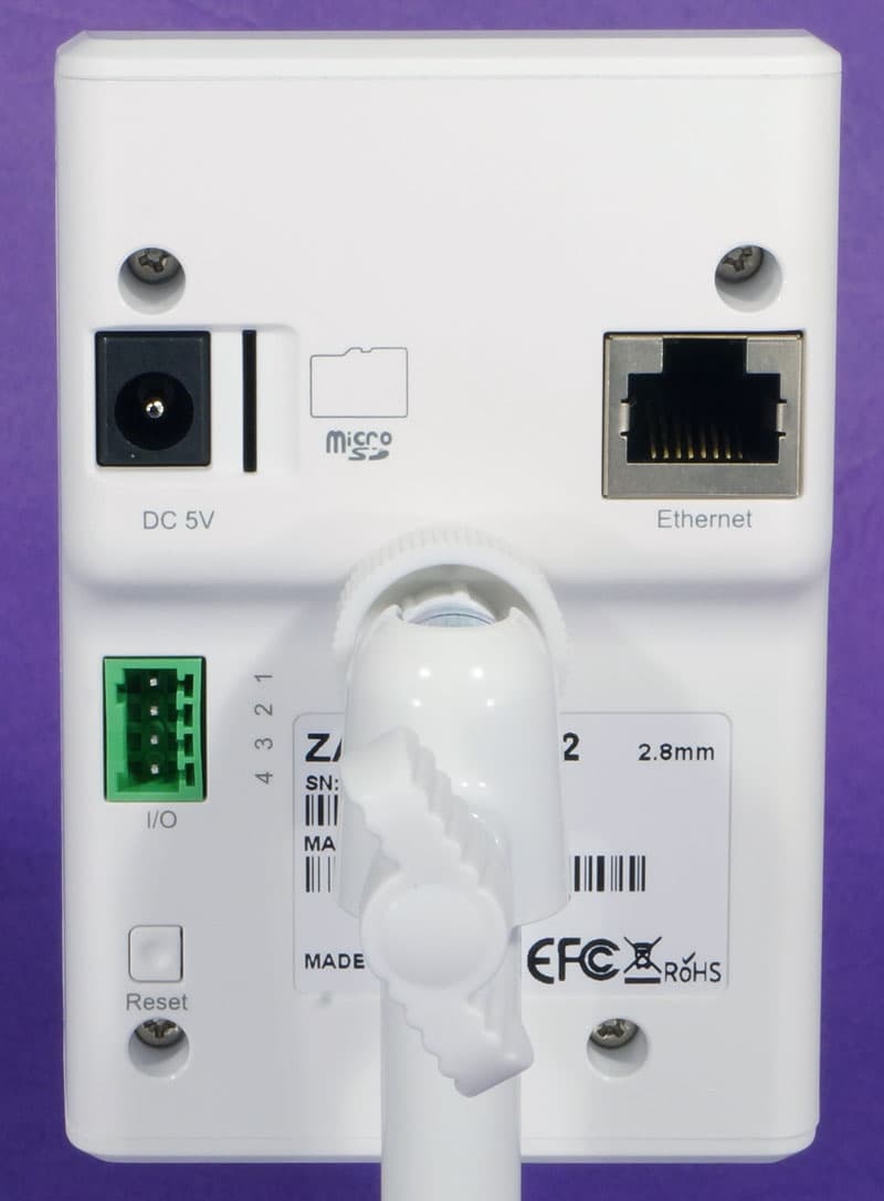 Служебные разъемы размещены с обратной стороны корпуса. Здесь расположены вход адаптера питания, слот для карты памяти micro SD, сетевой разъем LAN, разъем колодки сигнальных входов/выходов, и кнопка Reset для перезагрузки камеры и возврата к заводским настройкам.