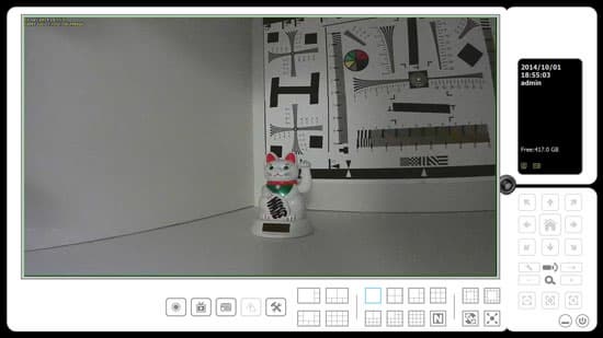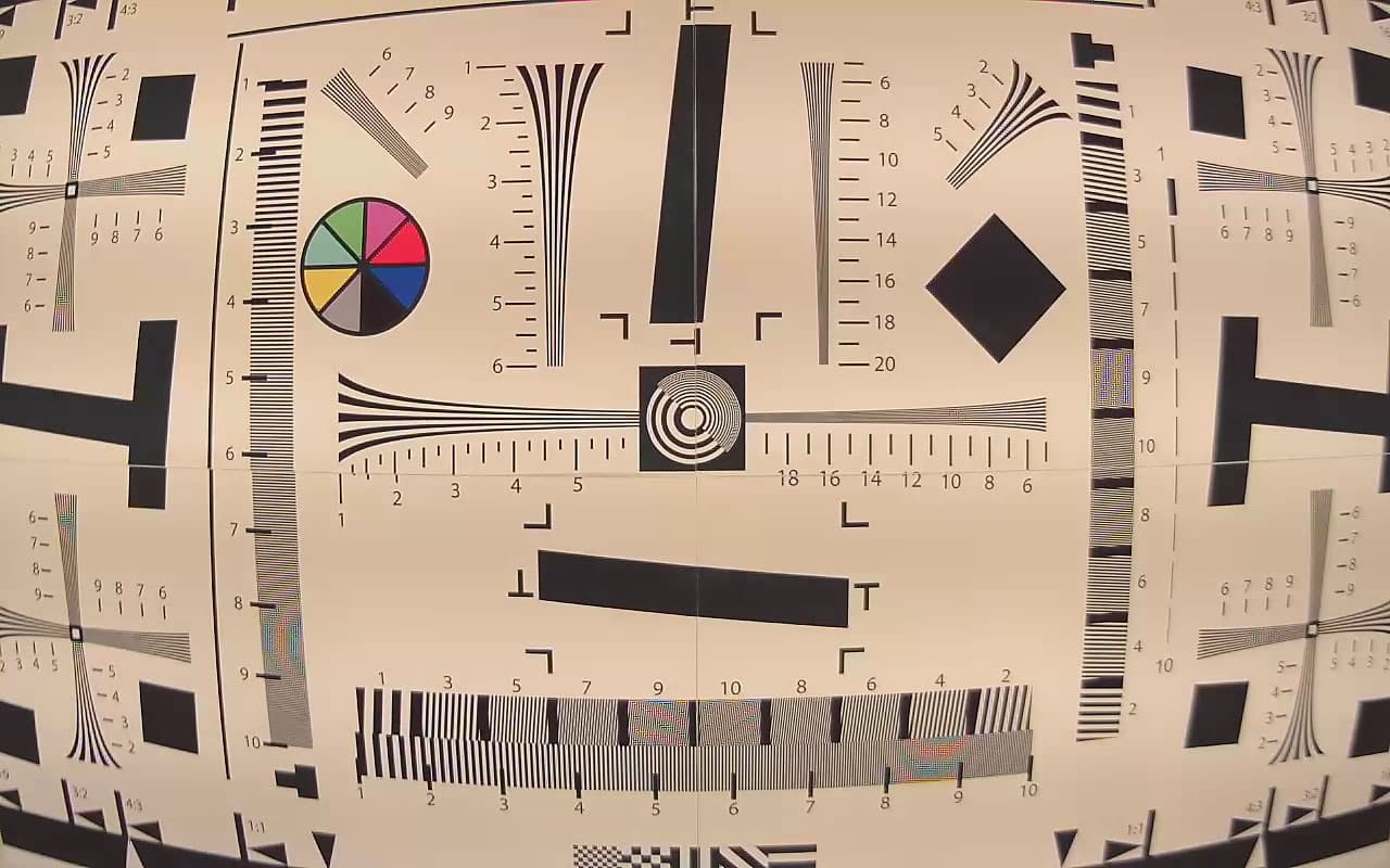 Разрешающая способность любой камеры обычно измеряется посредством съемки тестовой таблицы (миры), при этом существует правило: таблицей нужно закрыть весь кадр. Небольшие отклонения допускаются, однако погрешность не должна превышать разумных пределов. В данном случае, как и со всеми широкоугольными камерами, имеется сложность: искажения объектива, или «рыбий глаз». Эти искажения не позволяют правильно определить границы миры, приходится ориентироваться по углам таблицы. Неоценимую пользу дает возможность ручной подстройки фокуса, ведь камеру при съемке приходится придвигать к таблице чуть ли не вплотную.