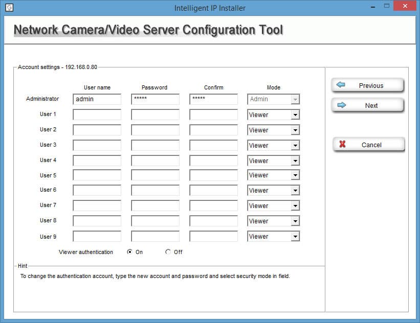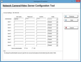 | Имя камеры, версия прошивки | Удаление, добавление, изменение учетных записей, имеющих право просмотра или контроля |