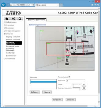 | Настройка событий. Здесь выбирается реакция камеры на срабатывание детектора движения | Настройка зон детекции движения. Точная подстройка чувствительности детектора и порога срабатывания |