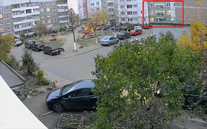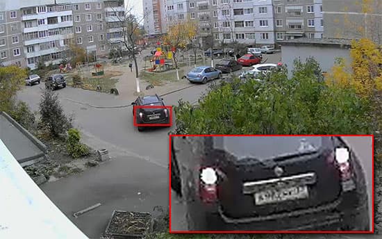 Как видим, чрезмерная резкость изображения, искусственно увеличенная, приводит к появлению контрастных ореолов, которыми окантовываются объекты. Если объект занимает небольшую площадь кадра, то ореол, становясь частью объекта, мешает его идентификации. Справедливости ради отметим, что задача рассматриваемой камеры вряд ли сводится к распознаванию автомобильных номеров с больших расстояний — данный пример приведен лишь для демонстрации особенностей сжатия материала камерой. Тем более, эта камера, предназначенная для эксплуатации в помещении, не имеет инфракрасного фильтра, что не лучшим образом сказывается на качестве съемки при естественном дневном освещении.