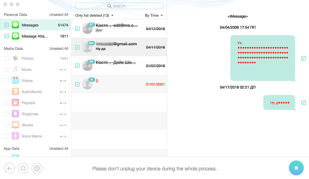 Для проверки работы Umate Pro смартфон iPhone 7 Plus 128 ГБ с iOS 11.3 сперва был просканирован программой PhoneRescue for iOS, которая призвана находить и восстанавливать стертый контент. Приложение очень долго сканировало созданный бэкап телефона. Спустя почти час появились первые результаты по сообщениям, которые заставили приуныть. Нашлись 13 действительно удаленных сообщений, даты отправки некоторых были испорчены. Триальная версия PhoneRescue for iOS не позволяла просмотреть полный текст iMessage, однако при поиске в телефоне по конкретным словам и датам стало ясно, что таких сообщений в iPhone и правда нет.