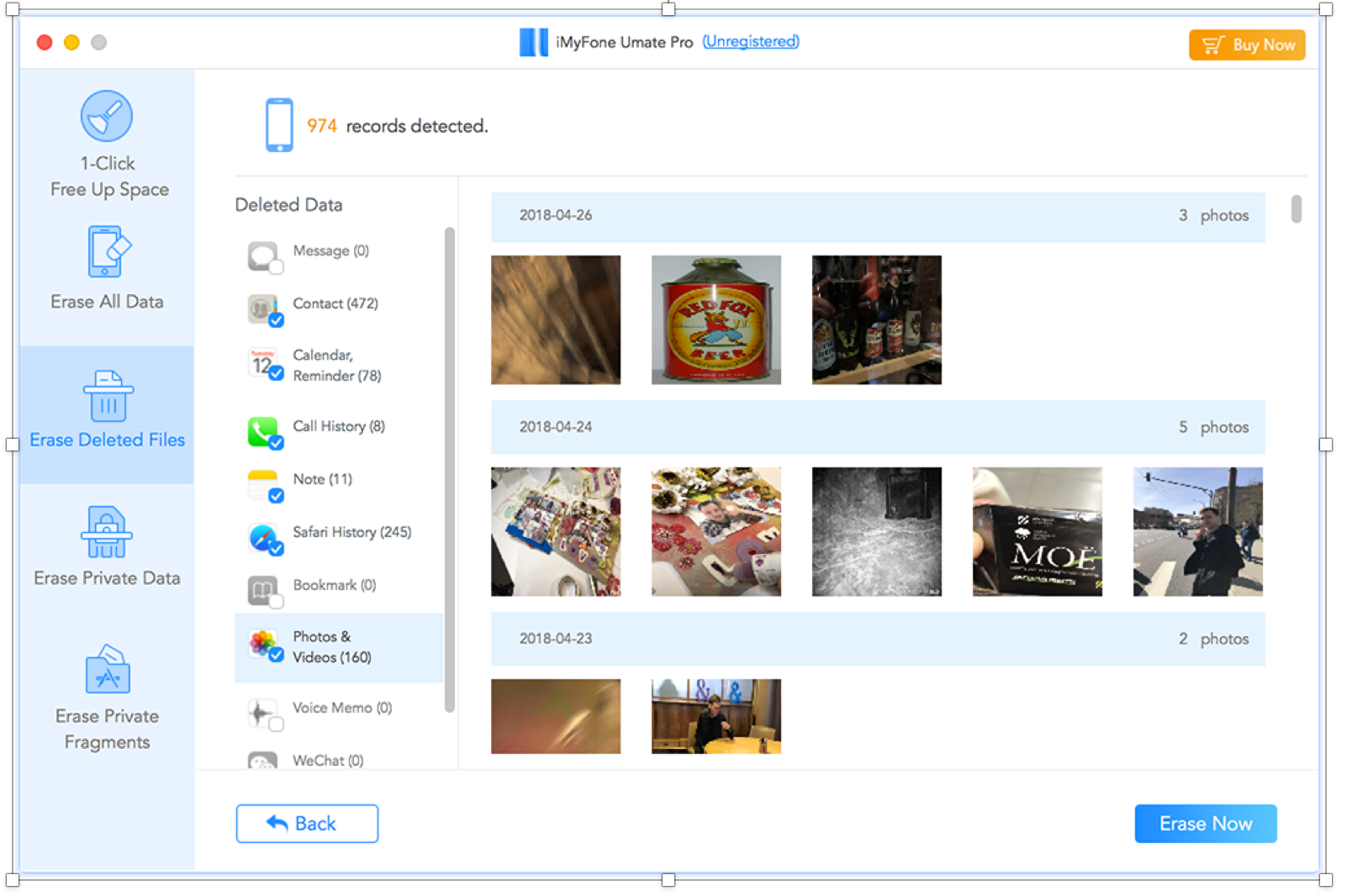 Erase Deleted Files, по идее, должен проверять устройство на предмет удаленных логически, но не физически данных. Umate Pro проверяет, какие фотографии, сообщения, заметки и звонки были помечены как ненужные и удаленные, а затем предлагает расстаться с ними навсегда.
