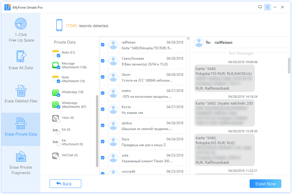 Erase Private Data позволяет выборочно удалить любой контент без возможности последующего восстановления. В этом идущем по счету четвертым пункте реализуется основная суть приложения. Если вы хотите гарантированно избавиться от данных на мобильном устройстве, их нужно удалять именно через этот пункт Umate Pro. После сканирования программа покажет все данные, из которых можно выбрать конкретные сообщения, фото или другие вещи.