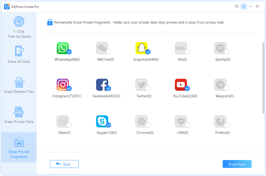 iMyFone Umate Pro может избирательно удалять следующие данные: сообщения SMS и iMessage, контакты, историю звонков и FaceTime, закладки и историю Safari, пароли из Keychain, заметки, фотографии и видео, записи в календаре, диктофонные заметки, историю карт Apple, приложения, фильмы, а также контент из сторонних мессенджеров WhatsApp, WeChat, Snapchat, Telegram, Viber, Instagram, Facebook и других приложений.