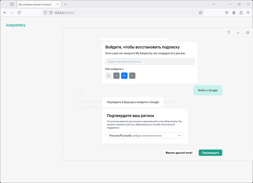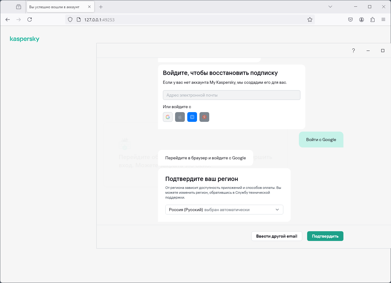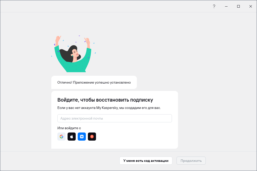 По окончании установки приложение предлагает пользователю войти в его аккаунт Kaspersky. Если рассчитывать на использование продуктов Kaspersky более широко, чем просто для тестирования, аккаунт разумно завести.