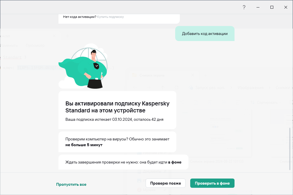 Сразу после активации подписки программный пакет начинает работать и предлагает запустить проверку.