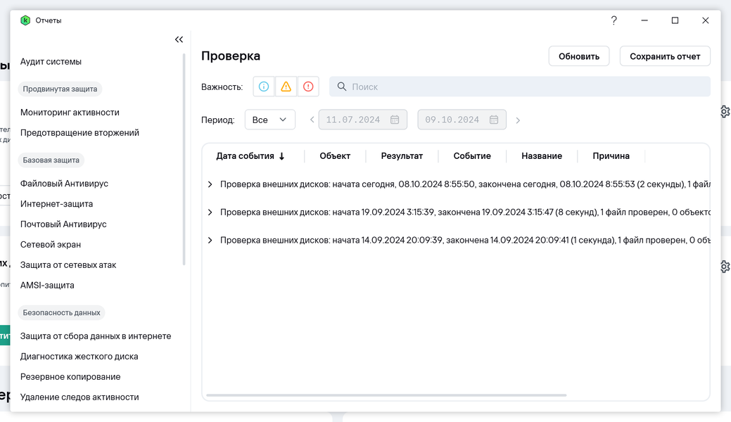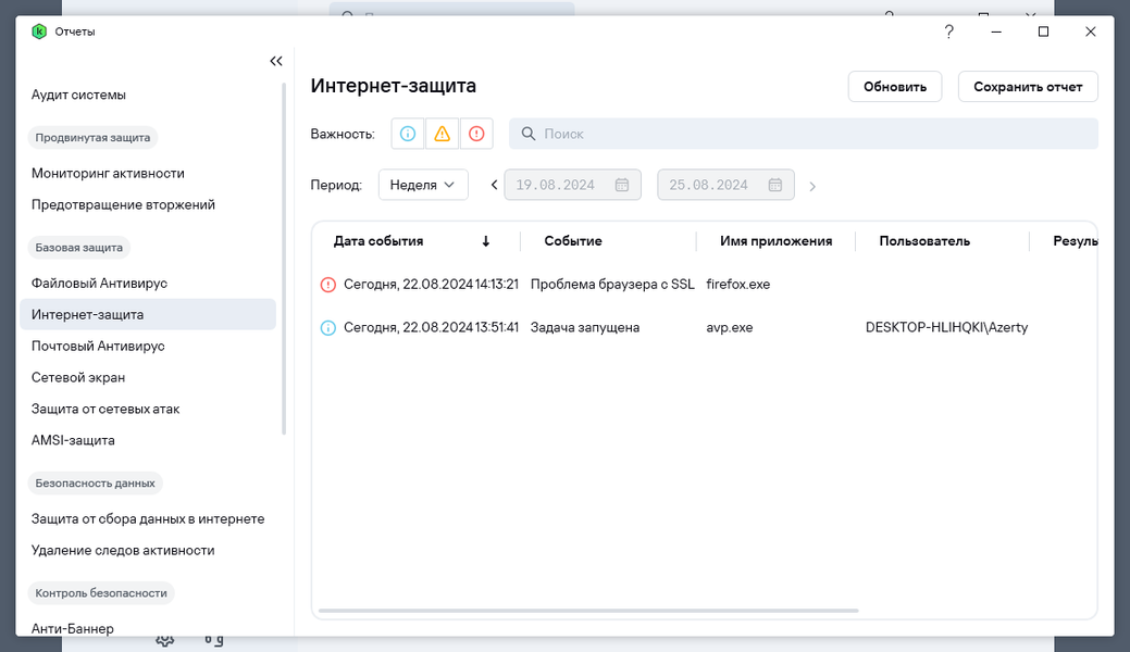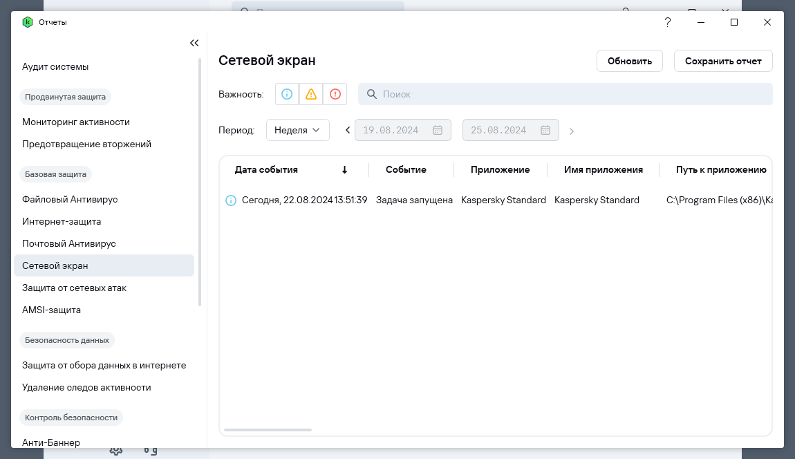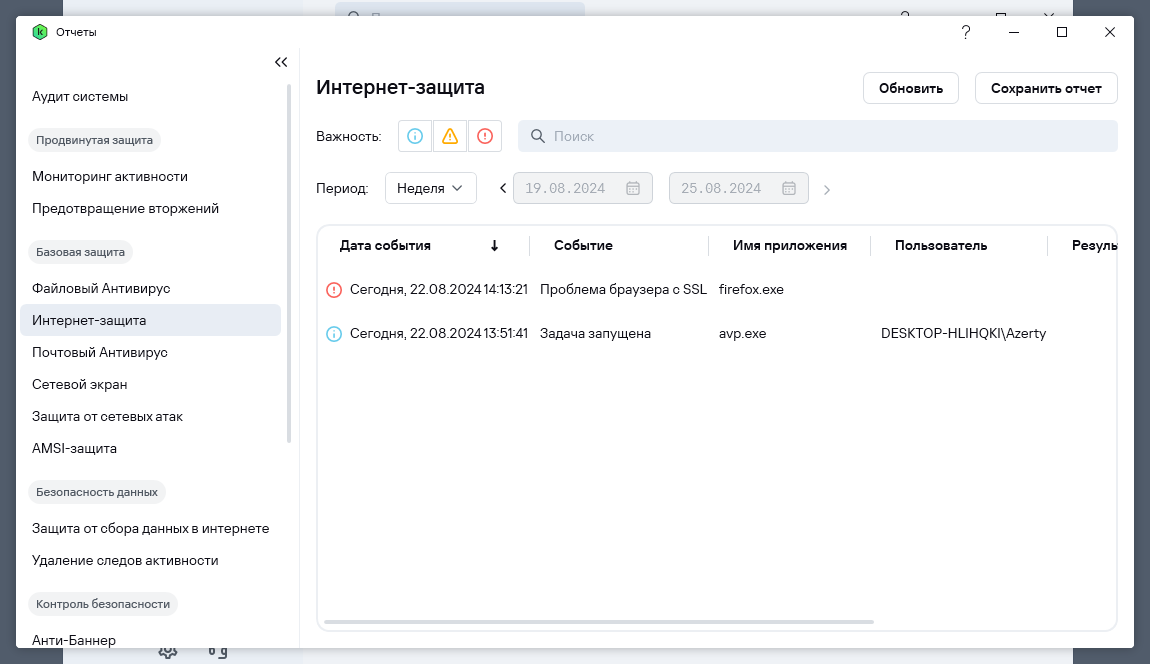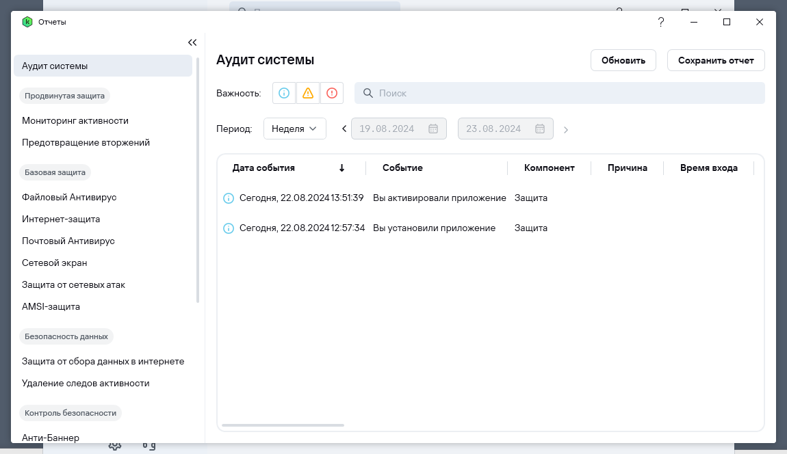 В приложении имеется подраздел Аудит, где можно справиться о том, что происходит и происходило в связи с работой Kaspersky Standard.