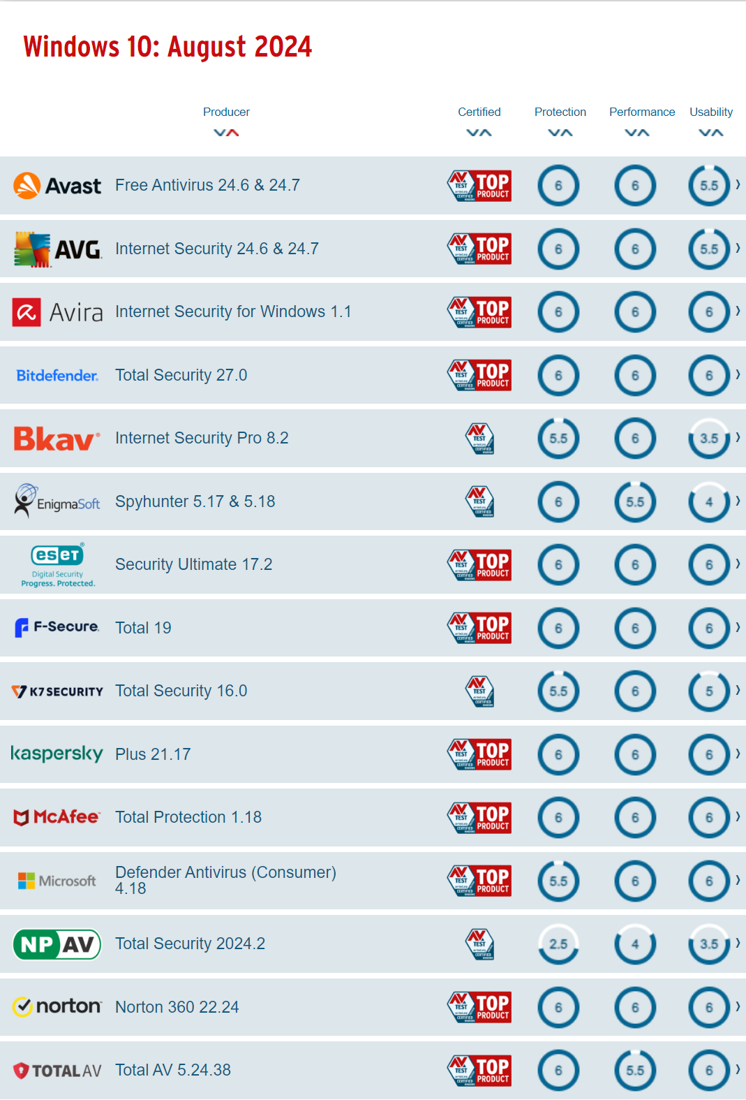 Авторитетный ресурс AntiVirus-Test в 2023 г. назвал Kaspersky Standard продуктом года. Однако и в нынешнем году картина вполне достойная. Ниже в чартах упомянутого ресурса программы для защиты от киберугроз перечислены не в соответствии с рейтингом, а просто по алфавиту. Однако в вертикальных столбцах Protection (защита), Performance (производительность) и Usability (удобство пользования) максимальное количество баллов тестах равно шести, поэтому лидеры определяются без труда по этим трем шестеркам (символично: «666» — это число зверя). В левой колонке можно видеть свидетельство сертификации ПО и его принадлежность к топовым продуктам (Top product).