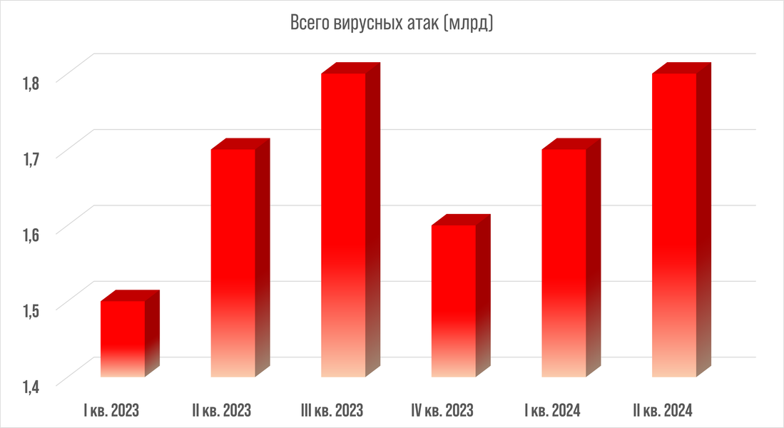Как свидетельствует агентство CompariTech, в первом квартале 2024 г. число вирусных атак на вычислительные системы увеличилось более чем на 200 млн (с 1,5 млрд до 1,7 млрд) по сравнению с аналогичным периодом 2023 г., а во втором квартале 2024 г. — на 100 млн (с 1,7 до 1,8 млрд). Можно предположить, что при сохранении существующей тенденции в III квартале текущего года их число приблизится к двум миллиардам, а к середине будущего года может преодолеть эту отметку.