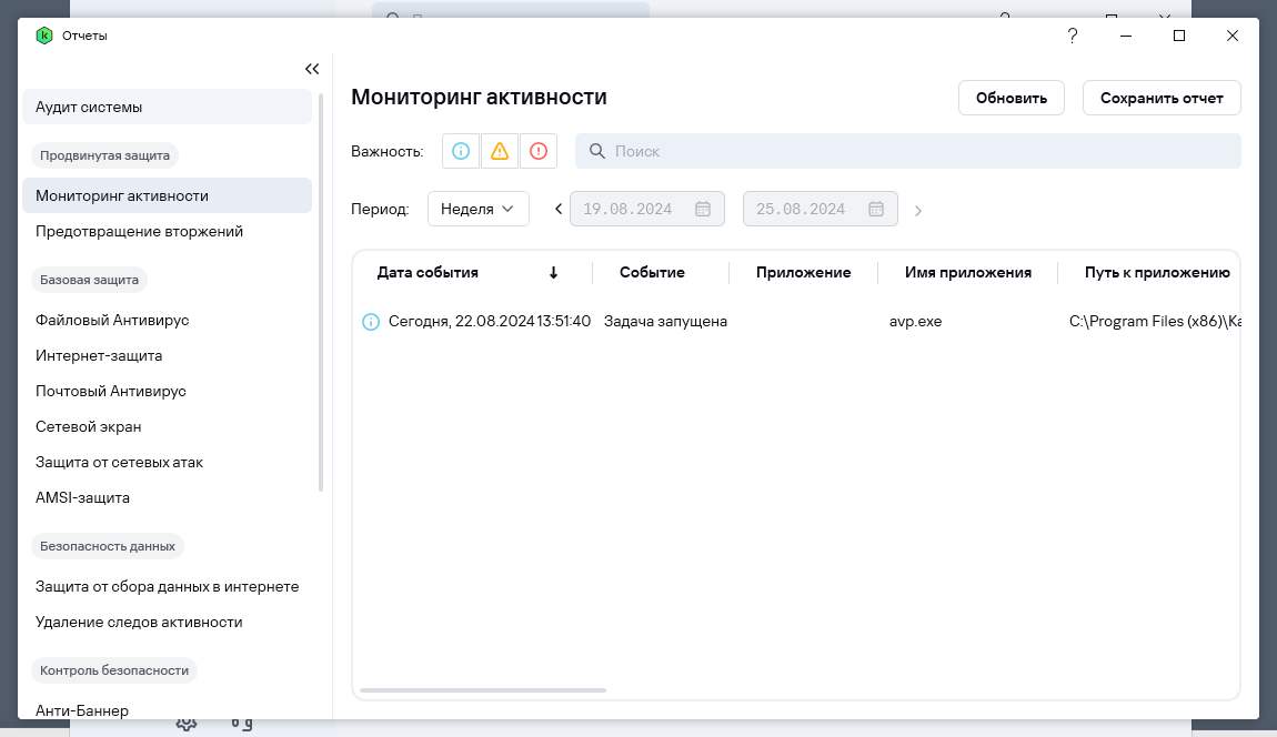 Здесь же можно узнать о том, какие приложения были запущены в период мониторинга активности. На скриншоте вверху в списке виден лишь один исполняемый файл — само приложение Kaspersky Standard (по традиции оно называется AVP, как когда-то называлась компания Евгения Касперского).
