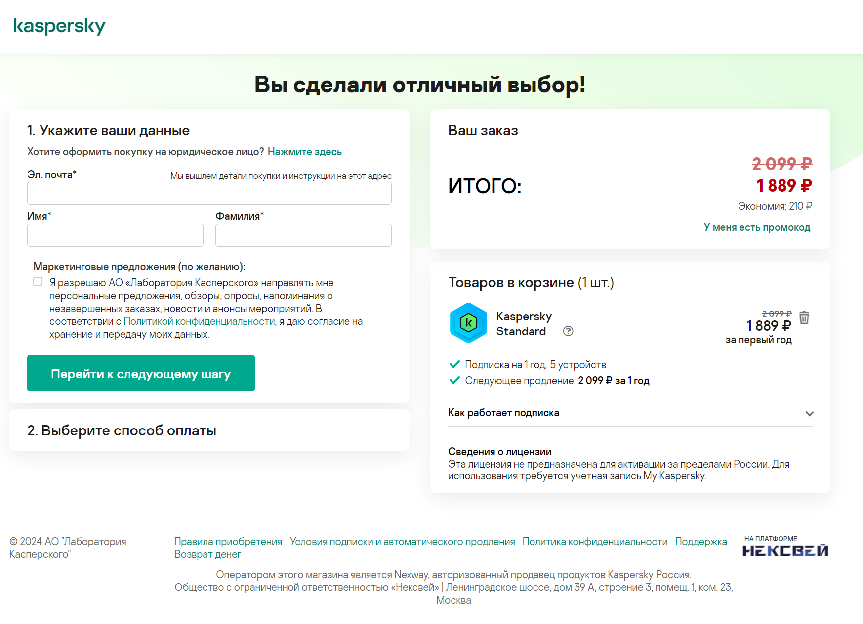 Классическая версия ПО доступна на сайте производителя kaspersky.ru. На момент подготовки настоящего обзора цена годовой подписки составляет 1889 рублей (с учетом специальной скидки 210 рублей). Причем нас сразу предупреждают, что через год возобновление произойдет уже по полной стоимости, 2099 рублей.
