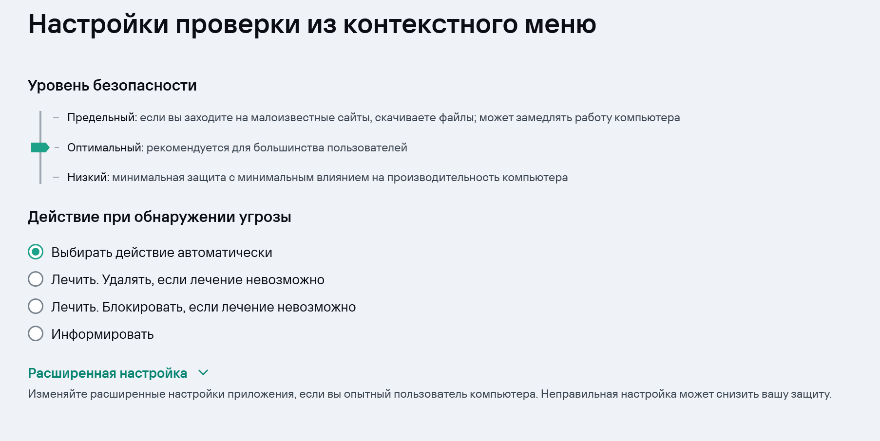 Действия при обнаружении угроз: выбор автоматических действий при обнаружении угроз, таких как удаление, карантин или уведомление пользователя.