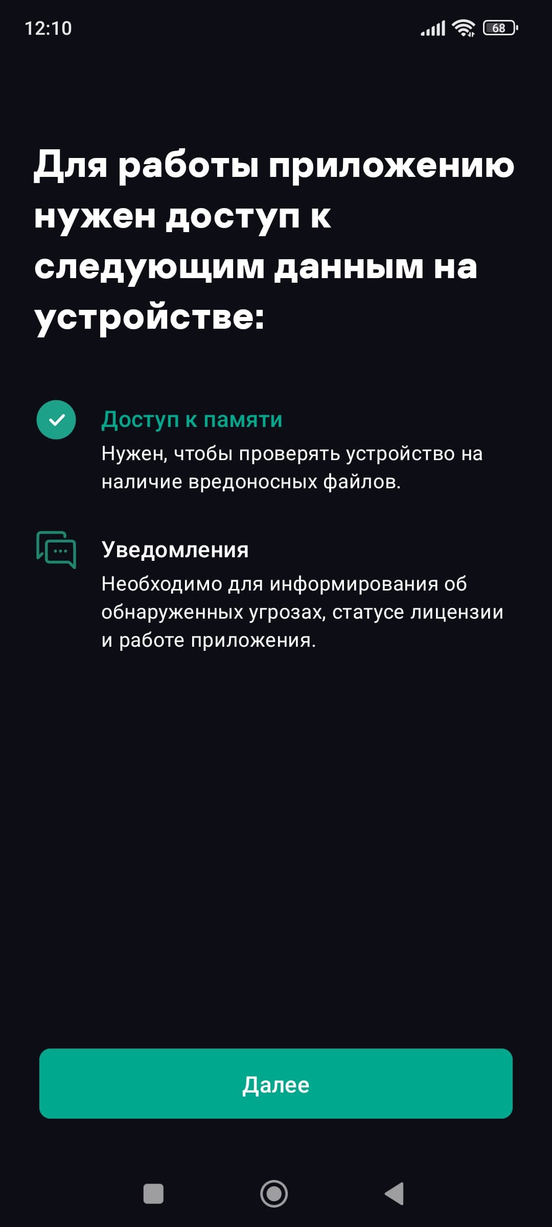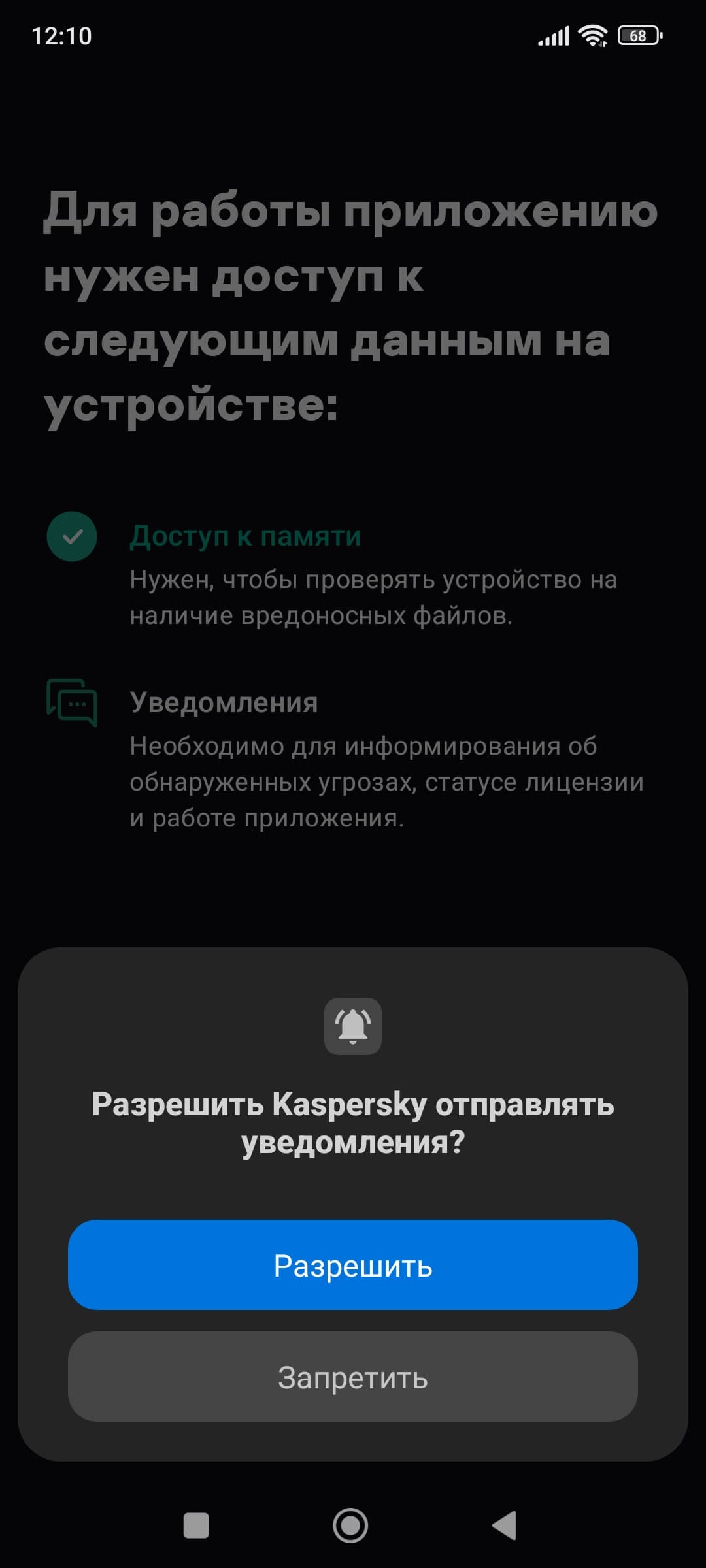 При установке необходимо предоставить приложению нужные права на доступ к компонентам аппаратной оснастки (например, для сканирования памяти на предмет вредоносного кода или враждебных резидентных модулей), разрешить отправлять уведомления (для информирования самого пользователя) и ввести приобретенный ключ. После этого подписка активируется. Запускаем приложение.